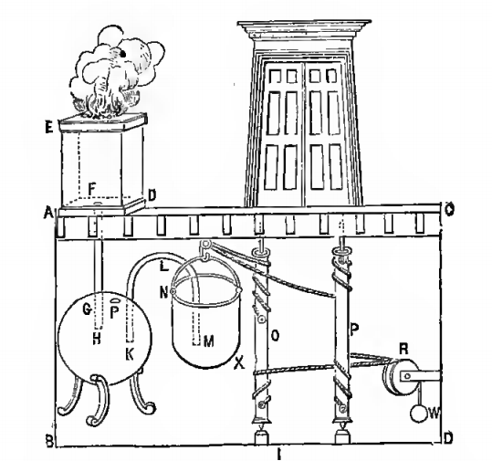 Figure 2. Hero’s (fl. 62 AD) door-opening mechanism. Hot air from the altar expands and enters the sphere and pushes water from the sphere into the bucket, the weight of which opens the temple doors. Source: Thurston 1895, 6.
