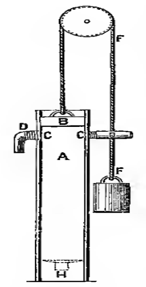 Figure 10. Denys Papin’s piston-cylinder steam engine (around 1690). Water at the bottom of the cylinder is turned into steam, pushing up the piston. The fire is then removed, the steam condenses, and the piston is pulled downwards, lifting the weight attached to the rope. As Thurston emphasizes, this is “the first steam-engine with a piston.” Source: Thurston 1985, 50.