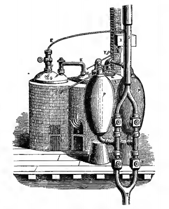 Figure 8. Edward Somerset, second Marquis of Worcester’s steam force and suction pump (1665). Steam is led into one container, forcing the water into the ascending exit pipe. The steam is then shut off, and the condensation of the steam creates a vacuum which sucks water up the pipe from below. The two containers suck and push alternately. Source: Thurston 1895, 22.
