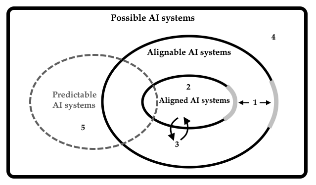 The figure highlights five important but not exhaustive tasks. First, we must try to determine what we consider to be the characteristics of aligned AI systems and which systems are possible to align by those standards. The grey zones of the boundaries emphasize that our criteria of alignment are likely to contain grey areas. It is important to figure out where these grey areas are and not to wander around in them if the stakes are high. Second, there is the technical challenge of building aligned systems. If an AI system operates over longer timeframes, learns, and changes, we will be faced with a third challenge: to prevent aligned systems from becoming misaligned and to realign misaligned systems. The latter is only possible if the AI system is not more powerful than us. This reminds one that building a plastic superhuman AI system is a potential one-way ticket to misalignment, even if the ride is smooth at first.